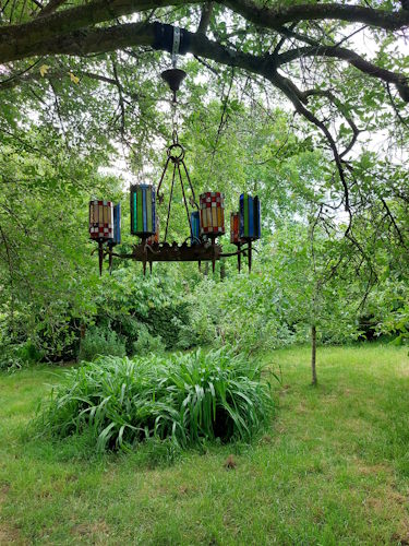 Wrought iron garden chandelier with stained glass shades