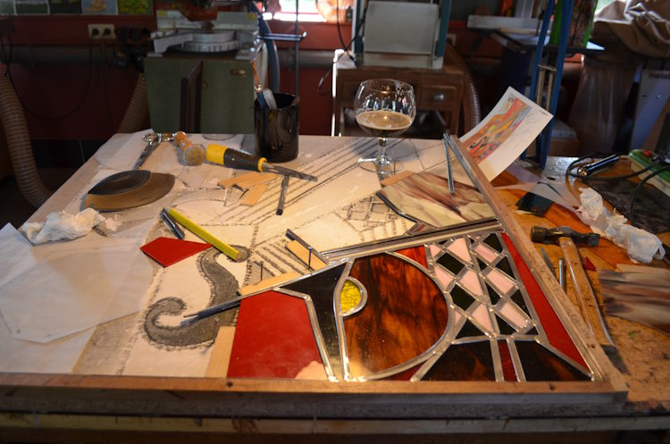 Studio work making stained glass Picasso