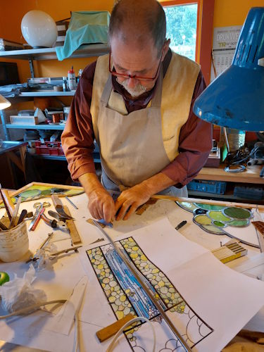 Studio work making stained glass waterfall