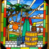 Stained glass windows with themes such as The Hunt, poppies, red roses and hydrangeas.